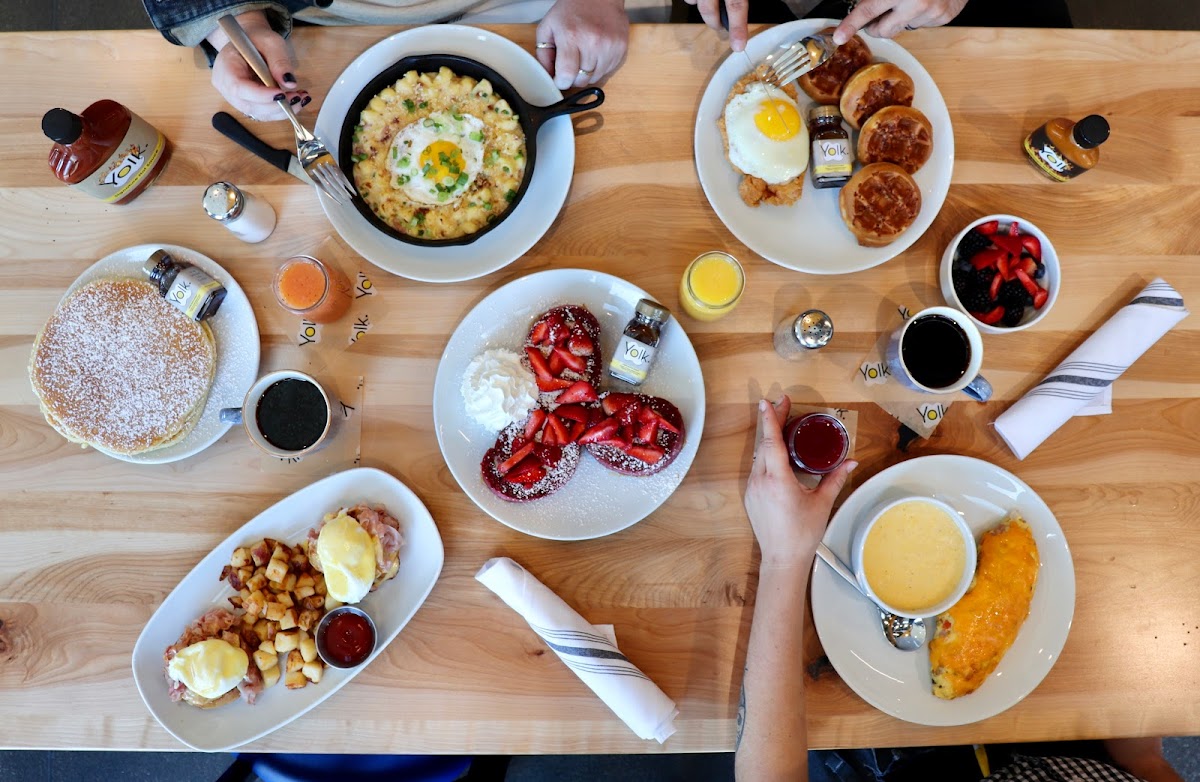 One standout feature of Yolk Preston Center is its extensive menu, offering pancakes, waffles, chicken & waffles, hash skillets, biscuits & gravy, eggs benedict, sandwiches, and more. Customers rave about the flavorful house drip coffee and unique hot sauces exclusive to Yolk.